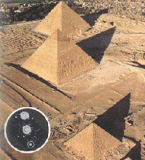Nesta foto do The Image Bank, constata-se que o alinhamento das três grandes pirâmides egípcias, coincide espantosamente com o posicionamento das estrelas da constelação de Órion, tal como se situavam há mais de 10 mil anos antes de Cristo. Além de guardarem nas suas estruturas conhecimentos técnicos e científicos ainda hoje desconhecidos, elas podem ser a prova cabal quanto à existência de civilizações muito evoluídas no remoto passado da Terra!